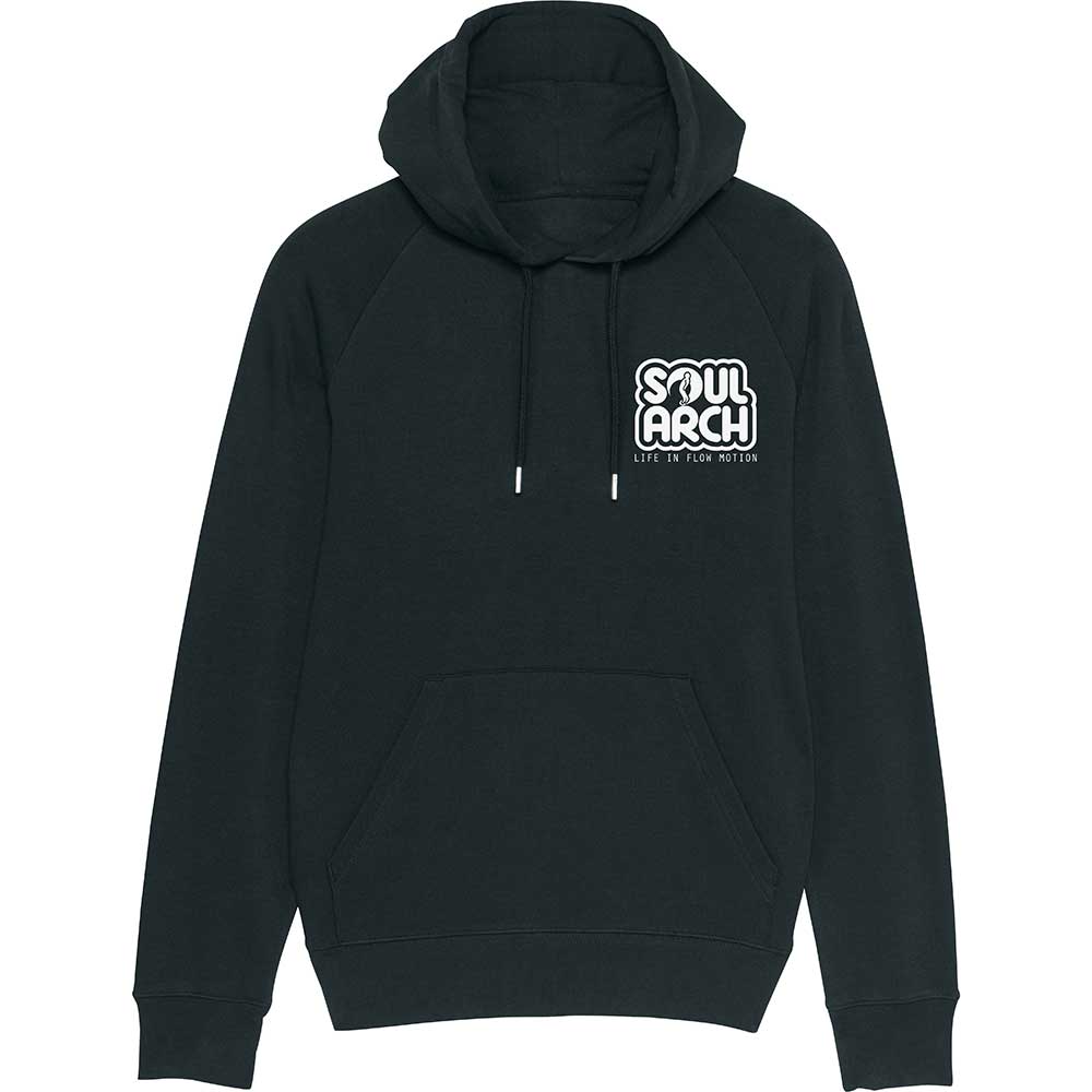 The classic Soul Arch logo printed on a heavy weight Black 85% organic cotton 15% recycled polyester and ethical hoody. Printed with a White eco-friendy ink for a nice soft feel. Perfect for keeping you snug and warm on those chilly days and nights.