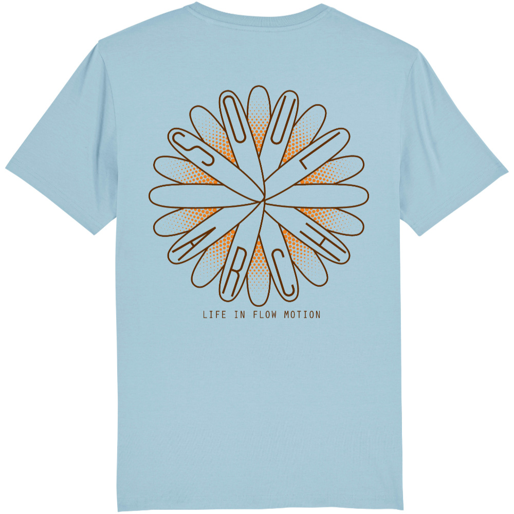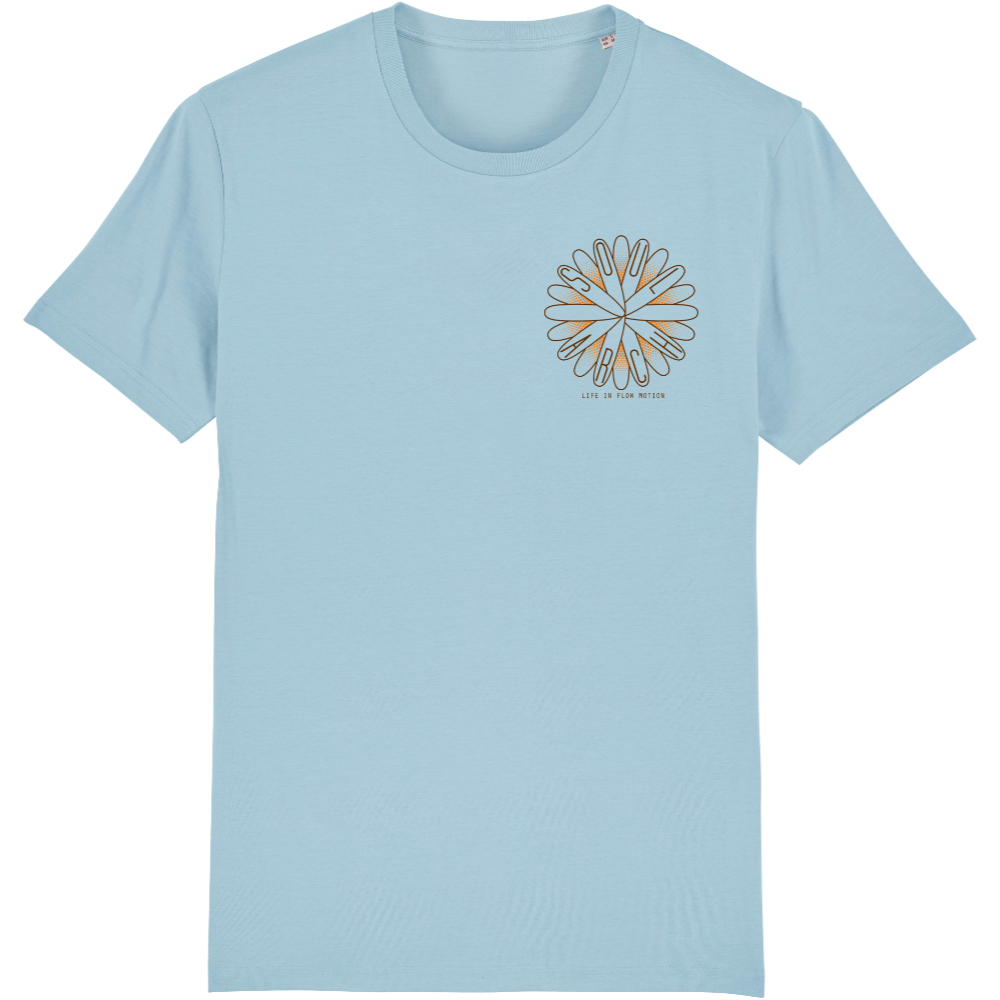 Circle design printed on a Sky Blue 100% organic cotton and ethical t-shirt. Printed front and back using eco-friendy ink for a nice soft feel.